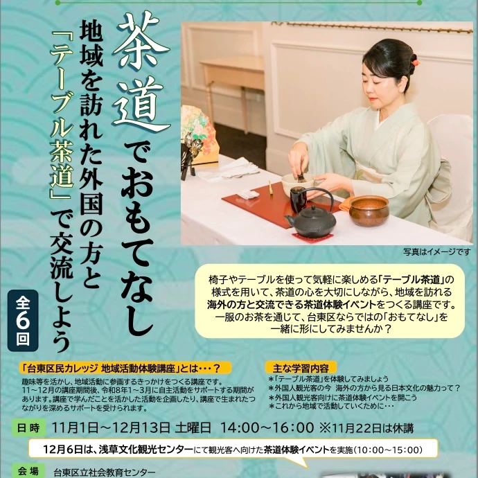 講師兼アドバイザーとして関わらせていただいた、台東区立社会教育センター様の連続講座の集大成として、浅草文化教育センターにて「抹茶で感じる日本のおもてなし」が行われました。 茶道のミニ講話とお点前披露、そして体験も2種類から選べるという充実ぶり。 お部屋は会議室でしたが、皆様の知恵と工夫と素晴らしいチームワーク、そして温かいおもてなしの心のこもったお茶会となり、大変ご好評いただきました。