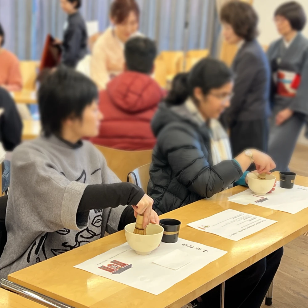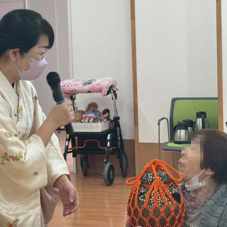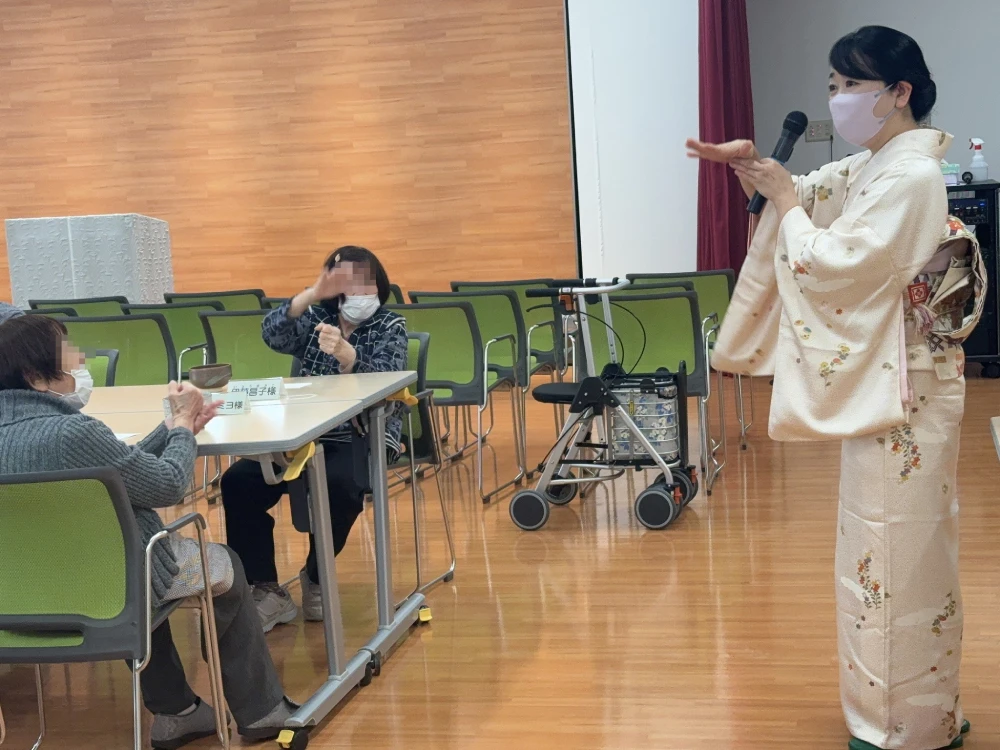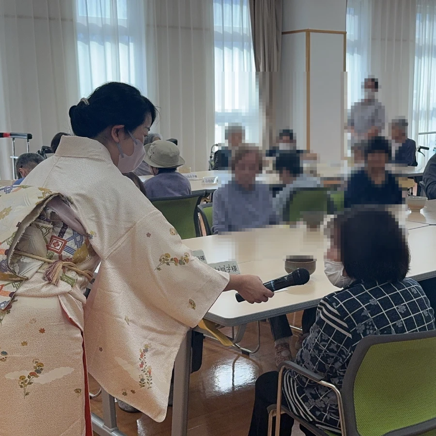 2024年7月より毎月1度お伺いしております。現地には抹茶茶碗など茶道具が揃っているおかげで、車に乗せられる手荷物程度の茶道具と抹茶、和菓子のみ持参しております。皆様、わかることできること、集中力や意欲など様々ですが、季節感や心の触れ合いを大切にし、時には歌や手遊び、ミニワークを交えながら、毎回楽しく抹茶を点てていただいています。「次回はいつ?」「毎回お菓子が楽しみ」という直接のお声だけでなく、当日どんなことをしたのかを施設の方に嬉しそうにご報告されていると知り、大変励みになっております。