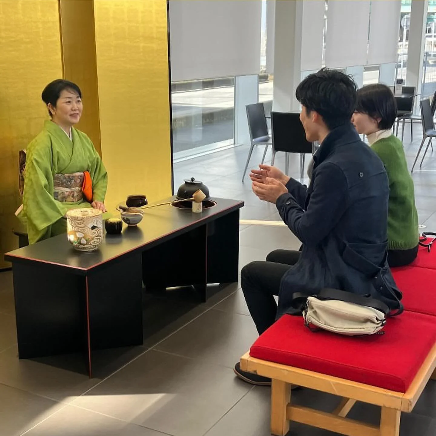 季節ごとにディーラー様が行うイベントの一つとして開催。天井の高い広々としたショールームの一角に、茶道専用のおもてなしスペースが設けられ、来場者1組(1〜4名様)ずつ、目の前でお点前をして、和菓子と共に抹茶をお楽しみいただきました。お得意様だけでなく新規のお客様も多数ご来場され、いつもとは違った、お客様との和やかな場作りができたとお喜びいただけました。自然とショールーム内での滞在時間ものび、落ち着いてお車を見たり、セールスご担当者との会話のきっかけにもなったようです。また1グループごとにゆったりとお茶席を体験できる特別感もあり、心からのおもてなしをお受け取りいただけたようで、お客様からも大変ご好評いただきました。