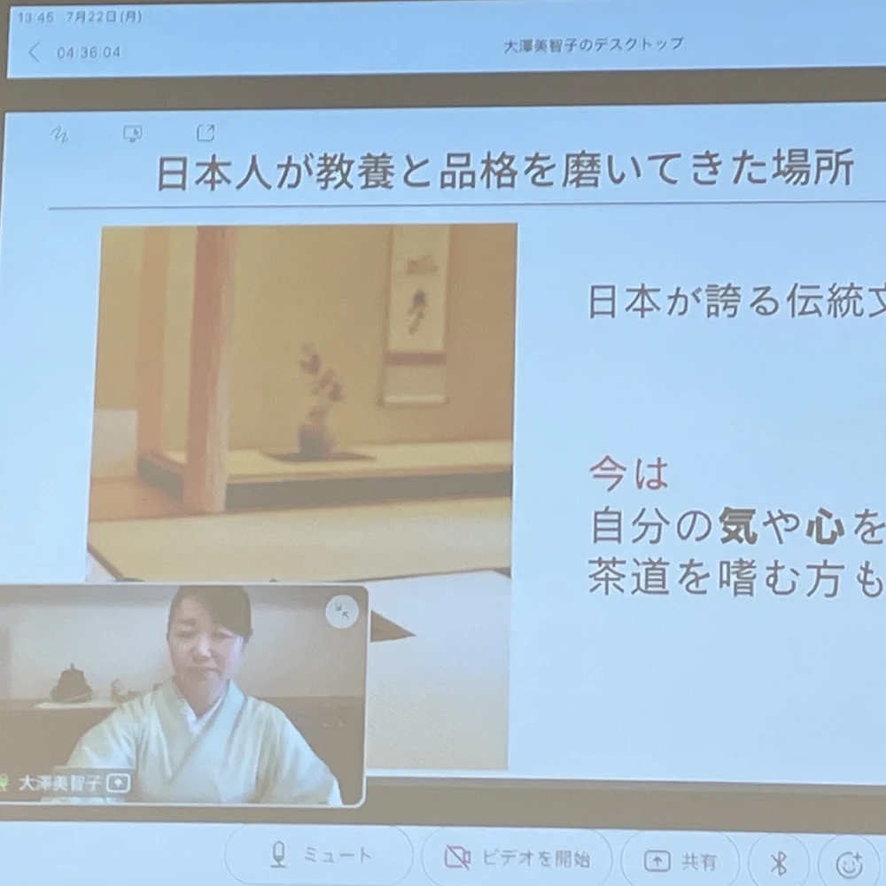 画面越しでしたが、しっかり体を向けて熱心に聞いてくださったり、後半のマインドフルネス抹茶体験も、熱心に、そして楽しそうに実践されておられました。 受講後アンケートでは、参考になった81.3%、やや参考になった6.3%と高評価をいただき、参考にならなかったという評価はゼロでした。また、『「凛とした佇まいとは」を学び、茶道の所作の美しさを見せていただくことでイメージアップができた。』『マインドフルネスは普段の生活にも取り入れたいと感じた。』『日常でも実践していきたい。』など嬉しいご感想のご報告をいただきました。