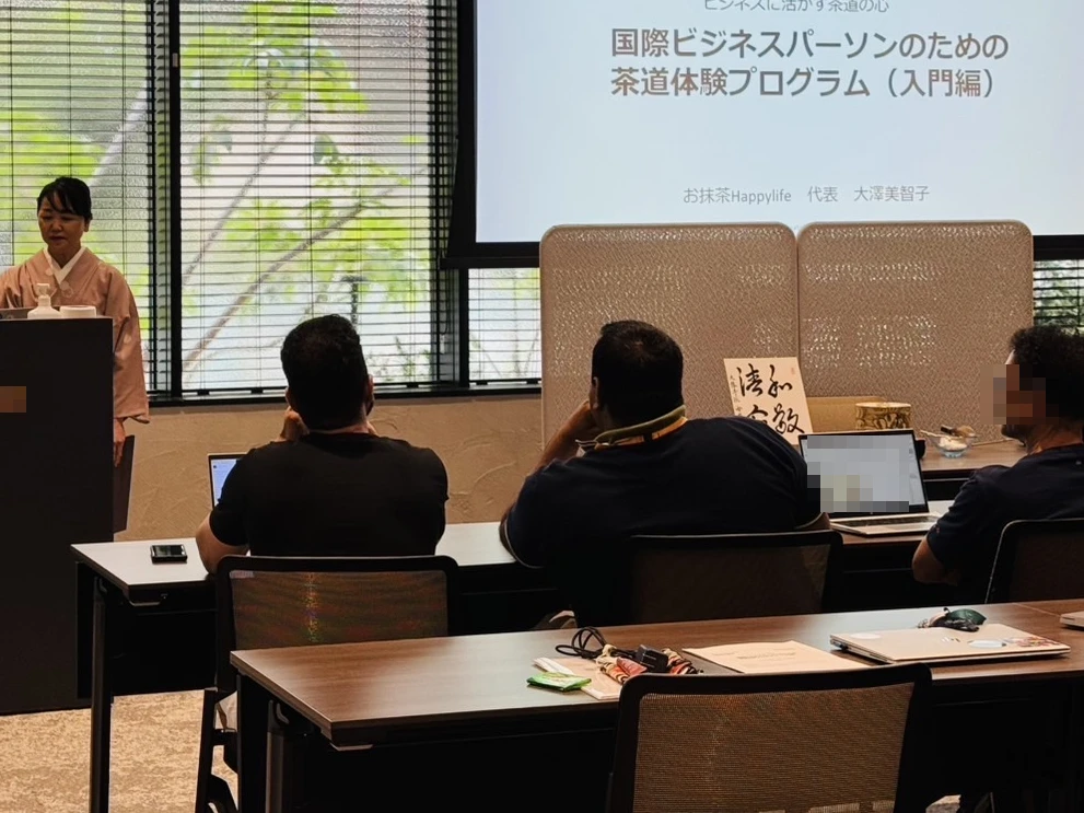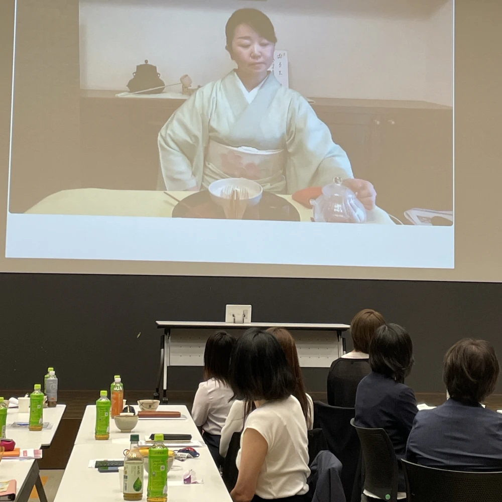 都内にある労働組合様のオフィス会議室で、パワーポイントを使用した茶道教養講座とテーブルお抹茶体験をご提供いたしました。全国から支部の代表の方がお集まりということもあり、茶道の一期一会の精神が、ビジネスやコミュニケーションにどう活かされるのかや、戦国時代から今の国際政治まで、心の距離を縮める有効な手段として茶の湯が活用されてきたお話なども交えながら、講演いたしました。